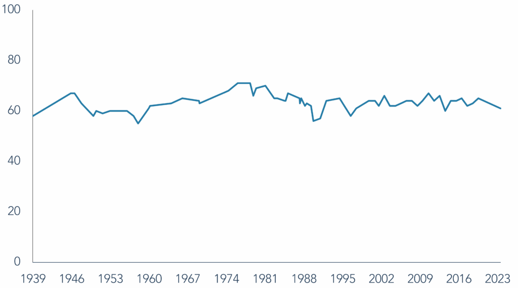 Source: Gallup, December 2023. 1939-1970 results are based on adults aged 21 and older. 1971-2023 results are based on adults aged 18 and older.